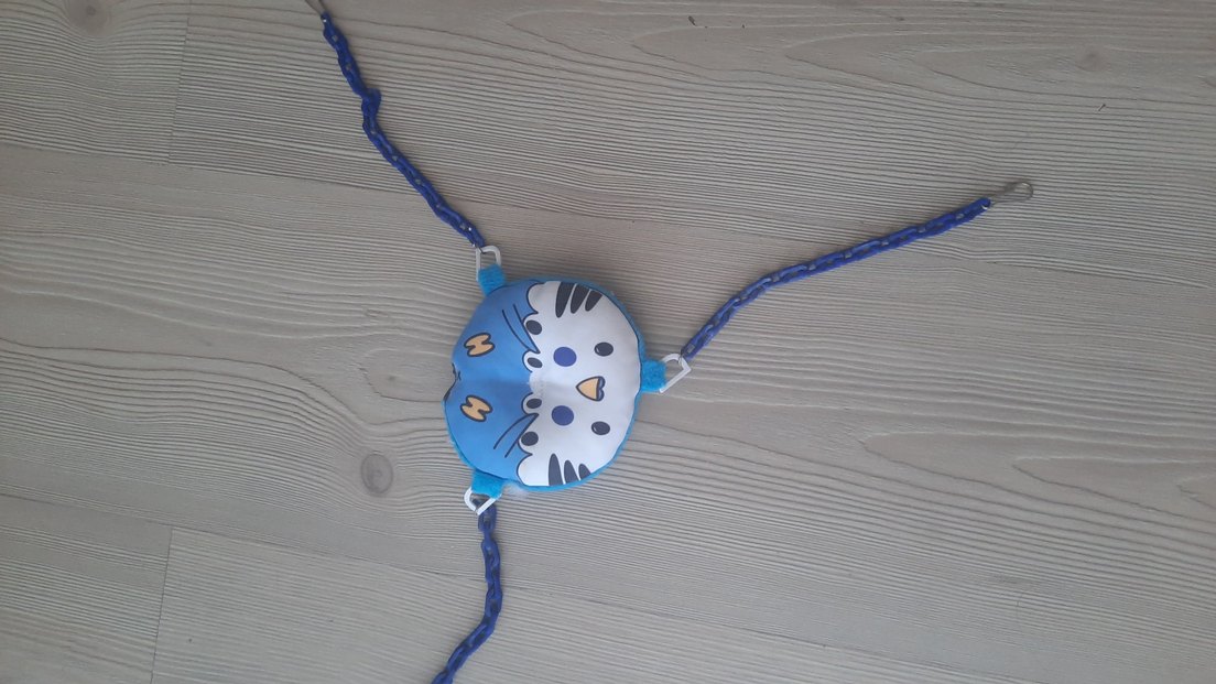 kuş arkadaşı kafesin icerisine takılıyormuş..Renkli mavi kedi şeklinde tasma, sevimli kedi yüzü deseni ve ayarlanabilir kayışlarla rahat kullanım sağlar.