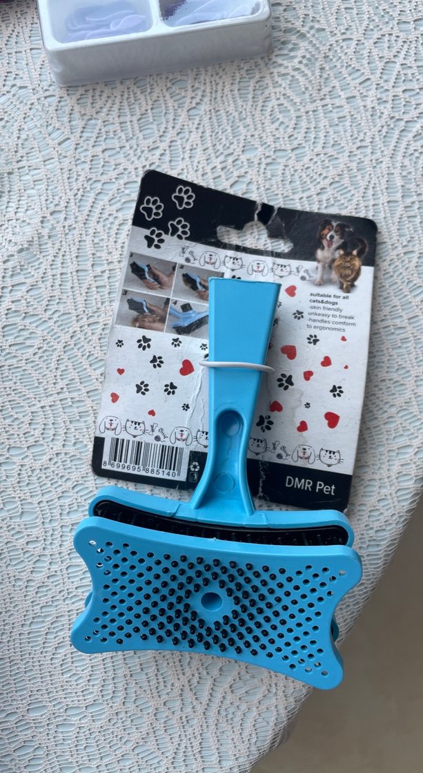 Renkli mavi kedi tüy toplayıcı fırça, tüm tüy tipleri için uygundur. Rahat saplı ve DMR Pet markalıdır.