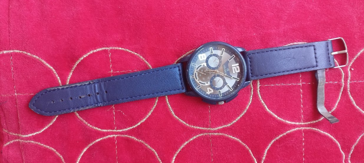 Renkli mavi kayışa sahip, klasik sokak stili tasarımlı, büyük rakamlı ve çoklu alt kadranlı erkek saati. ⌚