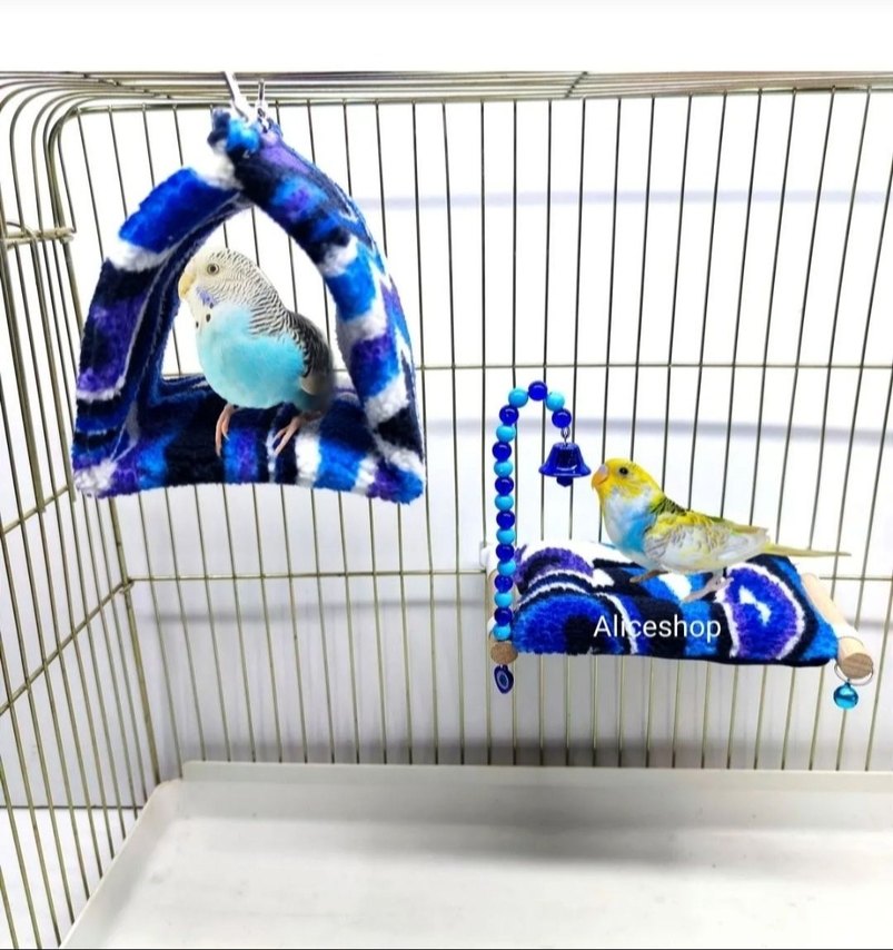 Yumuşak kumaşlı, renkli mavi kuş oyun ve dinlenme yatağı, oyuncaklı askılı detaylarla kuşların konforu ve eğlencesi için tasarlandı.