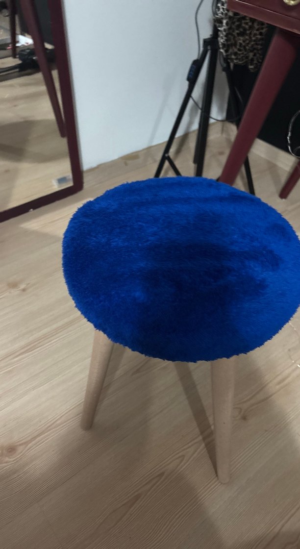 Renkli mavi yuvarlak yumuşak oturma yüzeyi ve ahşap ayaklarıyla gençler için rahat ve sağlam tabure.