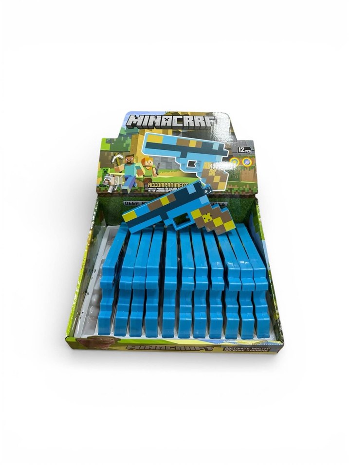 Renkli ve mavi tonlarda, blok tarzı piksel tasarımlı Minacrr oyuncak tabanca. Kutuda çoklu ürünler bulunur.