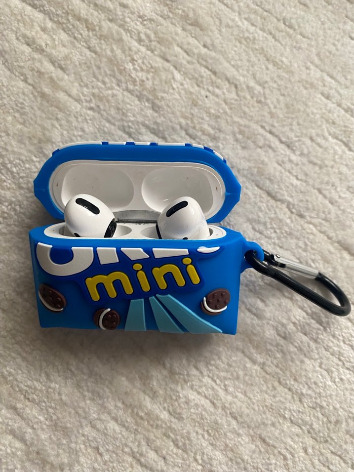 Renkli mavi mini kulaklık kılıfı, kulaklıklarınızı korur ve taşıma klipsi içerir. Üzerinde Oreo'mini' yazısı bulunur. Orijinal Airpods pro uyumludur.