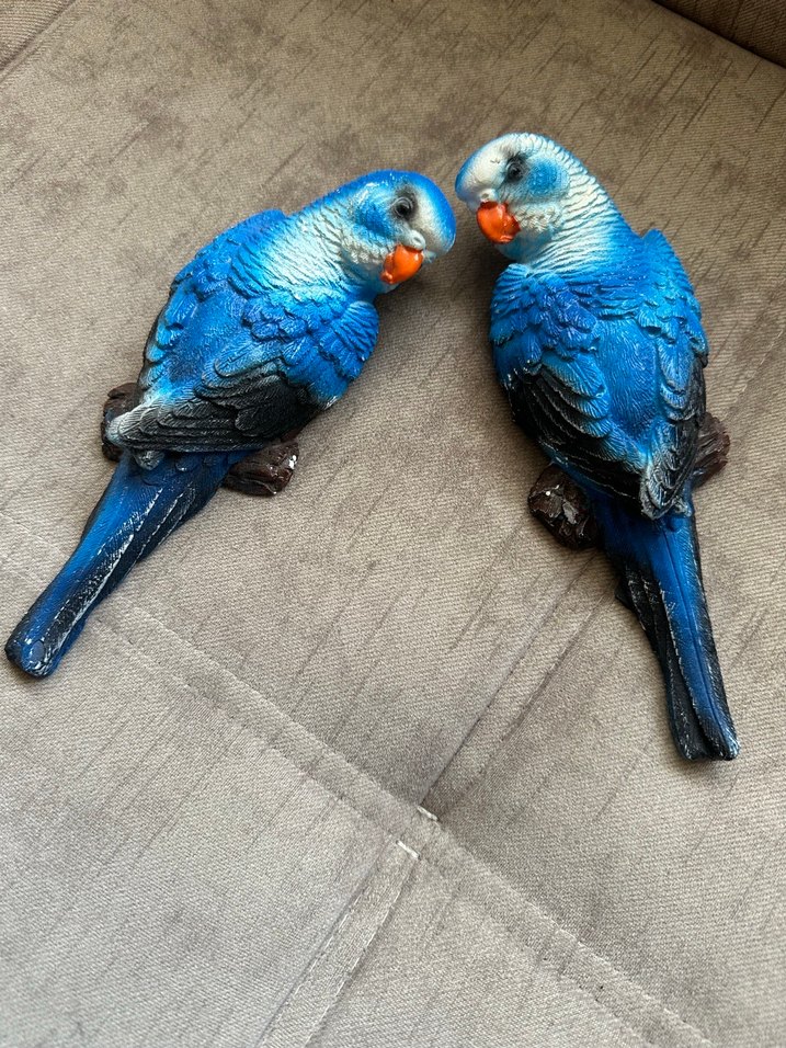 İki adet renkli mavi muhabbet kuşu biblosu, detaylı tüy yapısı ve parlak turuncu gagalarıyla gerçekçi görünüyor.