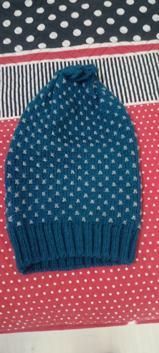 Renkli mavi ve beyaz detaylı örgü kadın bere, sıcak ve rahat bir kullanım sunar. Klasik ve özgün tarzıyla dikkat çeker.