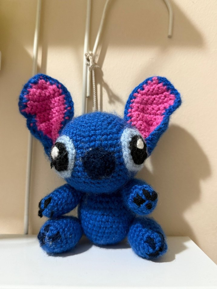Yumuşak iplikten el yapımı, büyük kulakları ve ifadeli gözleri olan renkli mavi örgü oyuncak. 15cm