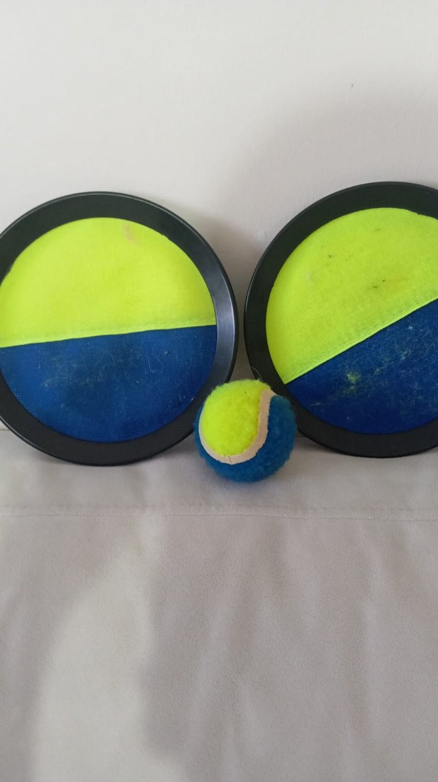 Canlı mavi ve sarı renklerde, iki yuvarlak raket ve top içeren renkli oyun seti. Dış mekan oyunları için uygundur.
