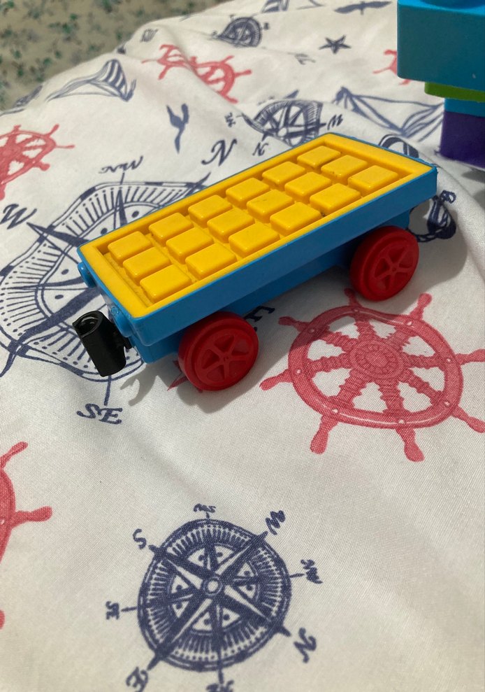 Renkli oyuncak araba, mavi gövde, kırmızı tekerlekler ve sarı üst kısmıyla oyun için uygundur. İnternette 5 euro