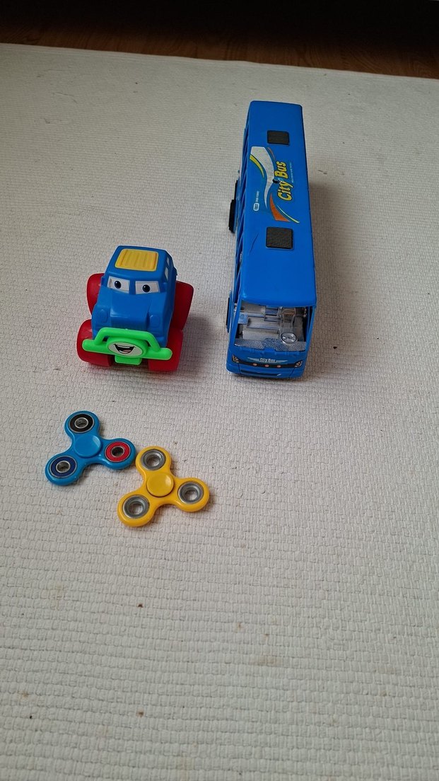 Renkli mavi oyuncak kamyon ve otobüs ile sarı ve mavi iki adet el döndürücüden oluşan set.