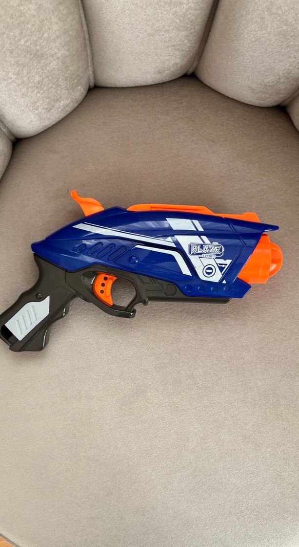 Mavi gövde, turuncu ve siyah detaylarla renkli oyuncak tabanca. Tetikli ve modern bir tasarıma sahip,Sorunsuz çalışıyor.