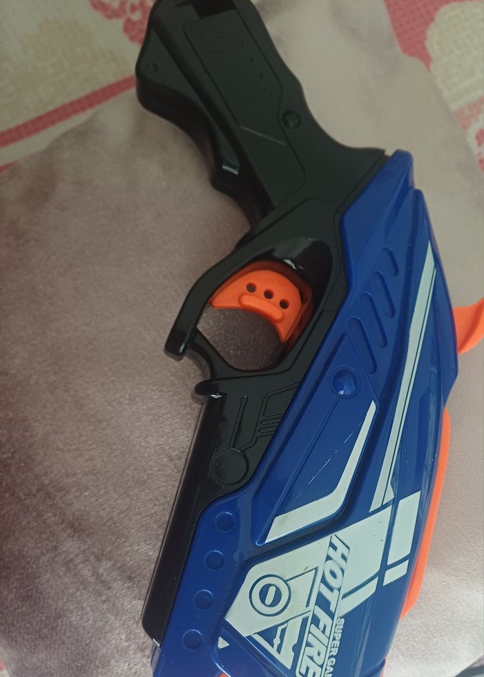 Renkli, mavi ve siyah gövdeli, turuncu tetik detaylı oyuncak tabanca. Oyunlar için uygun. nörf mermisi yoktur.