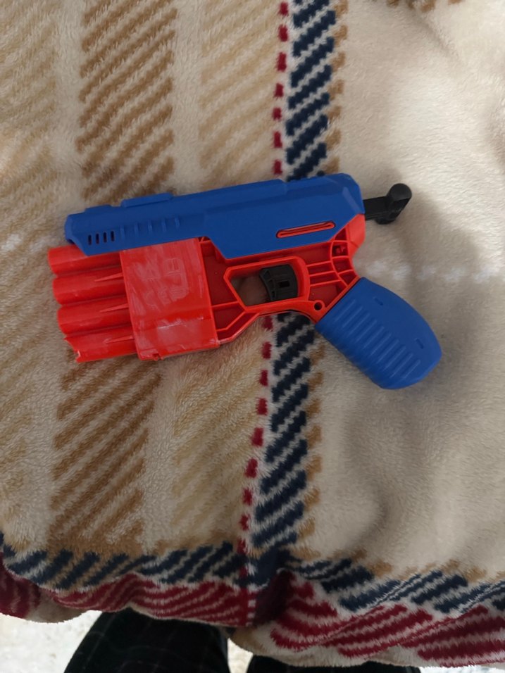 3 adet fiyatıdır Mavi saplı ve çok bölmeli kırmızı namlulu, renkli oyuncak tabanca. Nerf silahlar birinin ucu kırık sadece kullanıma engel değil evde ne üç varsa gönderilecek