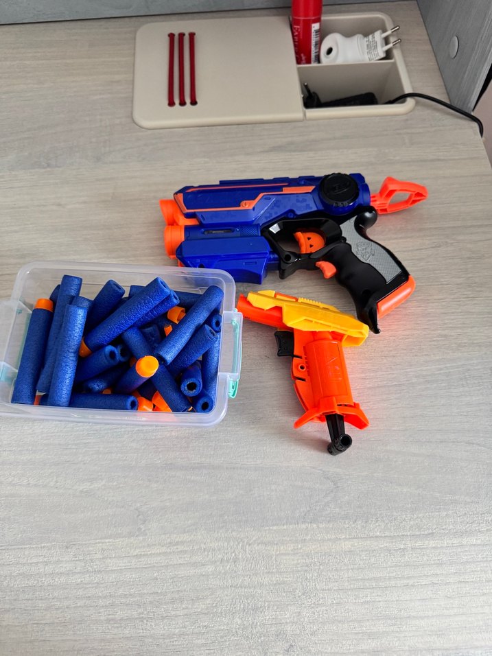 Renkli mavi oyuncak tabanca, turuncu oyuncak tabanca ve mavi sünger mermiler içeren set.