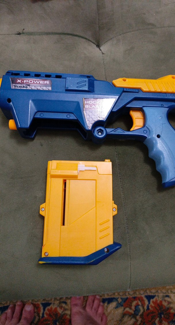 Mavi ve sarı renklerde X.POWER yazılı renkli oyuncak tabanca, çıkarılabilir şarjör ile birlikte gelir.toyz şoptan