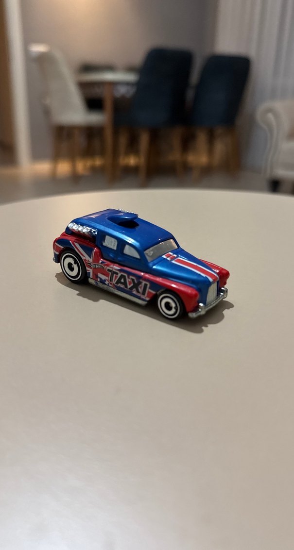 Yan tarafında CTAXI yazısı bulunan, kaputunda çizgiler olan renkli mavi oyuncak taksi arabası. Beyaz tekerleklere sahiptir.