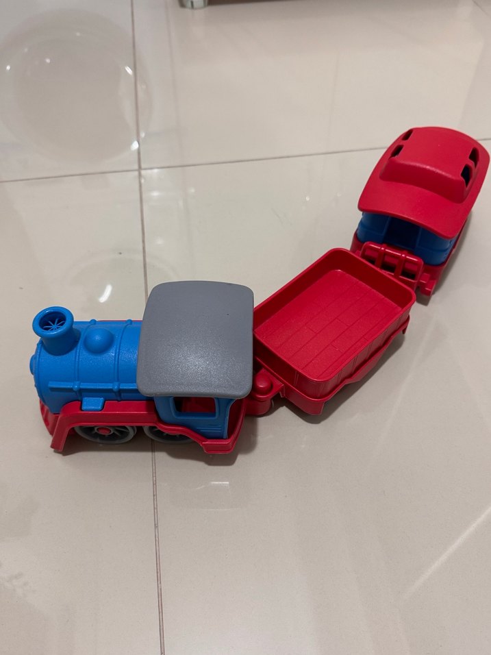 Mavi motor ve kırmızı yük bölümü olan renkli oyuncak tren arabası, oyun için tasarlandı.