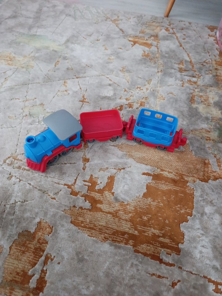 Bu renkli oyuncak tren seti, gri tavanlı mavi lokomotif ve iki kırmızı vagon içerir.