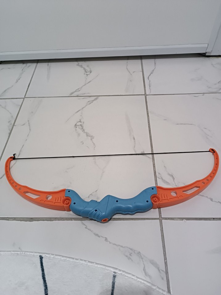 Mavi saplı, turuncu kollu renkli oyuncak yay, güvenli oyun için uygundur.
