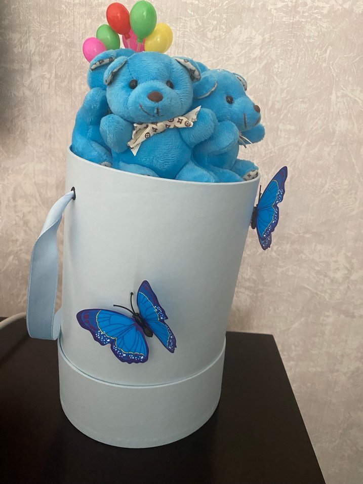 Renkli balon süslemeli, kelebek stickerlı silindirik kutuda mavi peluş ayıcık seti.