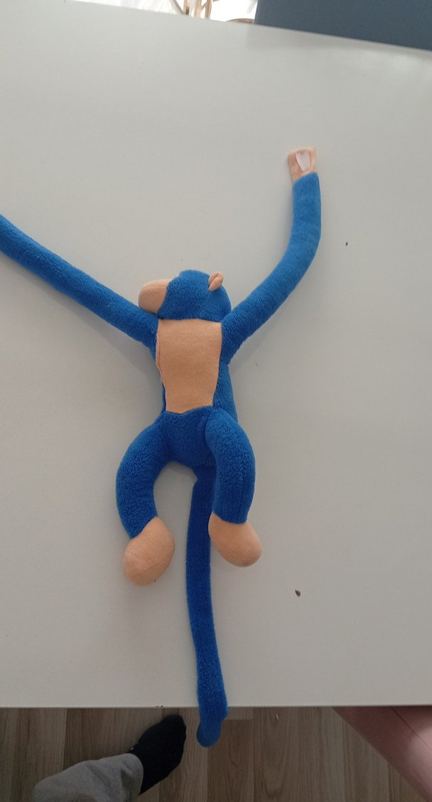 Yumuşak kumaştan yapılmış, uzun kollu renkli mavi peluş maymun oyuncak. yapıskanlı motorun arkasına takmalık aksesuar