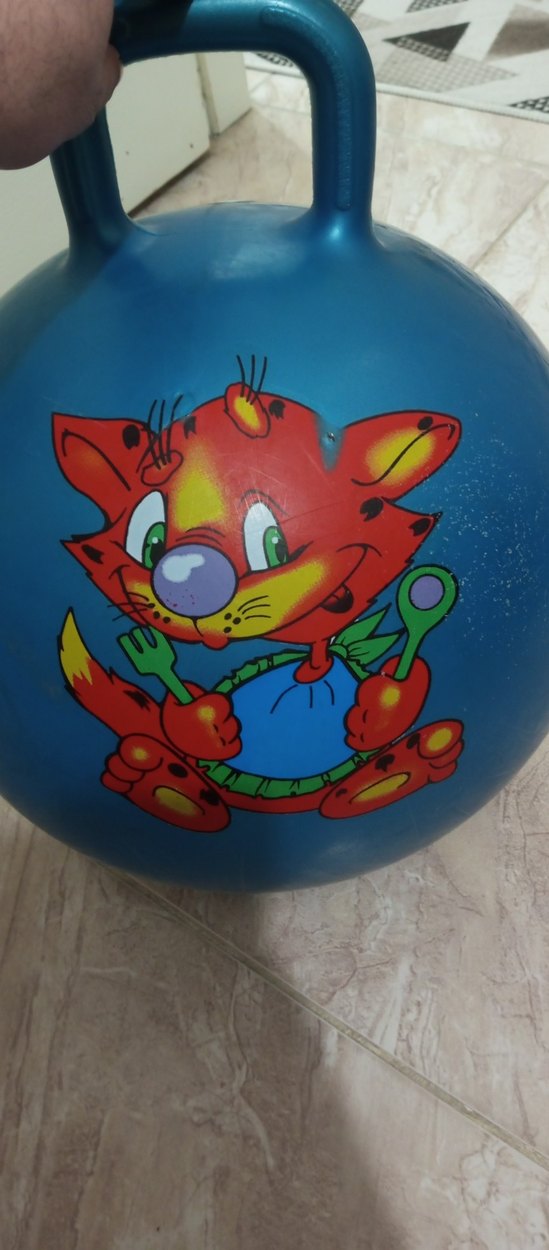 Renkli mavi top, çatal ve kaşık tutan sevimli bir çizgi film tilkisi figürüne sahiptir. Canlı renklidir ve eğlenceli oyunlar için uygundur.