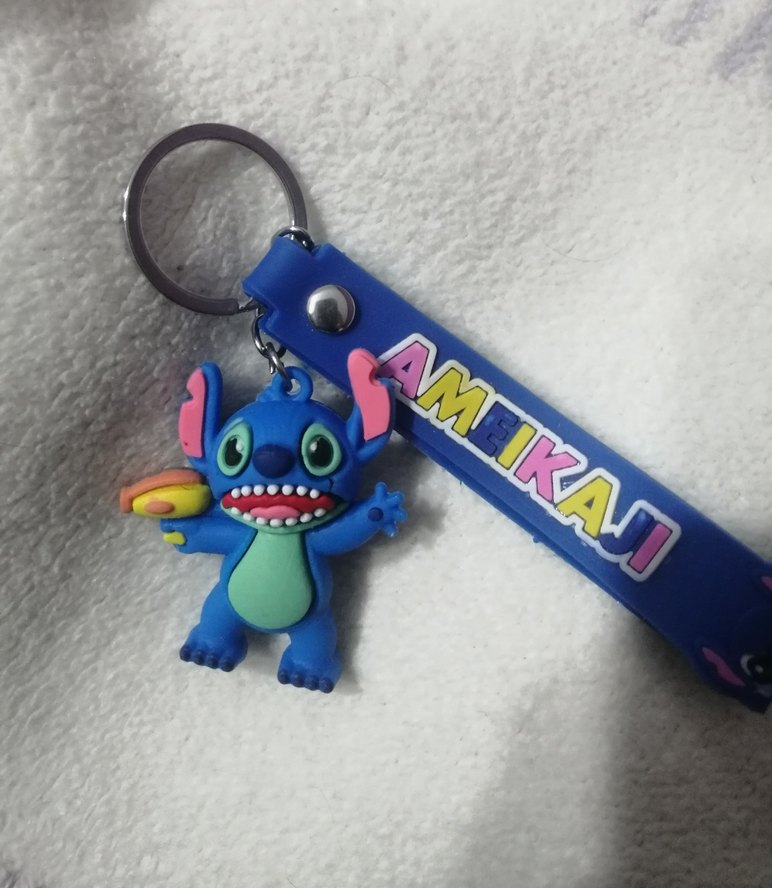 Renkli mavi anahtarlık, püskül ve grunge punk tarzında pop kültür figürü içerir. Üzerinde 'AMEIKASI' yazısı bulunur. #stitch #disney