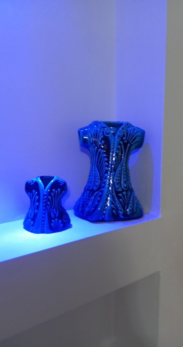 İki parçadan oluşan, desenli ve renkli mavi seramik vazolar seti, dekoratif kullanım için uygundur.