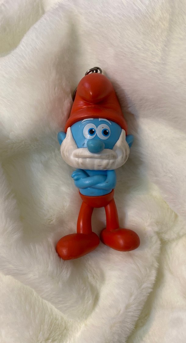 Kırmızı şapka ve pantolonlu, kolları çapraz renkli mavi Şirin figür anahtarlık.