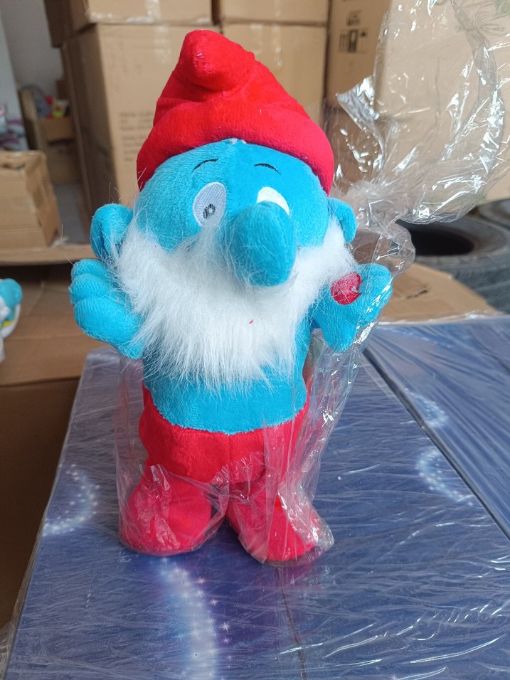 Kırmızı şapka ve botlu, beyaz sakallı yumuşak dokulu renkli mavi peluş cüce oyuncak. kafa kısımı yumuşak peluş şeklinde aşağı kısım sert figür şeklinde