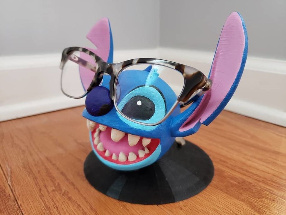 Detaylı yüz ifadeleri ve geniş gülümsemesiyle renkli mavi Stitch figürü, gözlük tutucu olarak kullanılır.