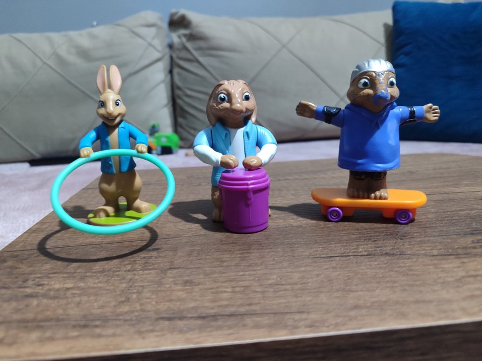 Mavi kıyafetli, halka, davul ve kaykay ile renkli tavşan figürleri seti.