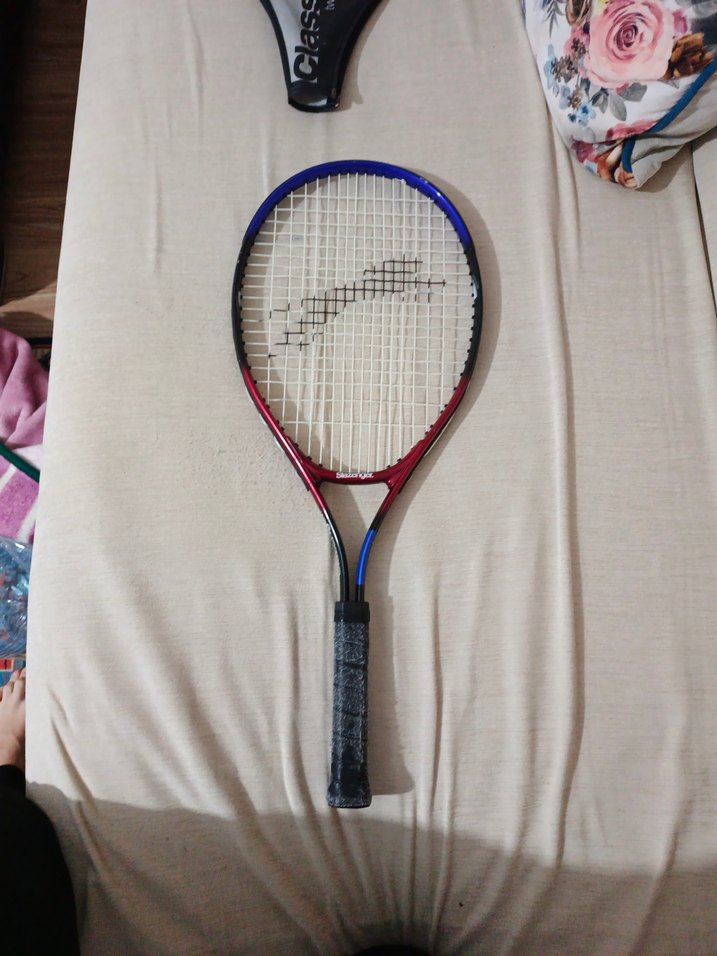 Mavi ve kırmızı çerçeveli, siyah saplı renkli tenis raketi, oyun setleri için uygun . Raket çalışır her türlü işinizi görür