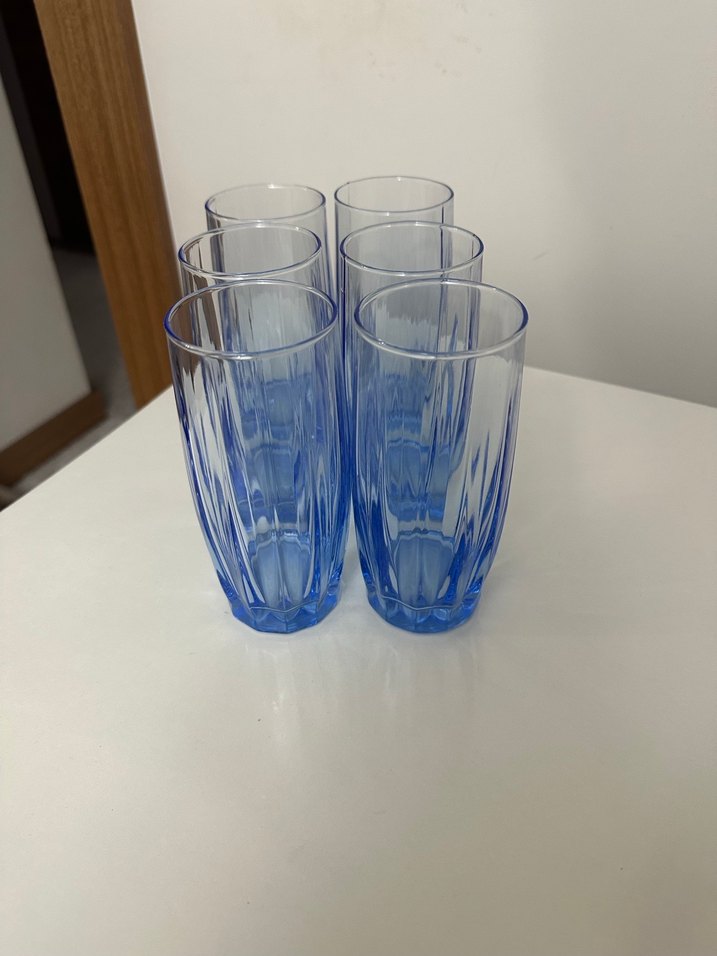 Altı adet, renkli mavi uzun ve desenli bardak seti, içecekler için uygundur.