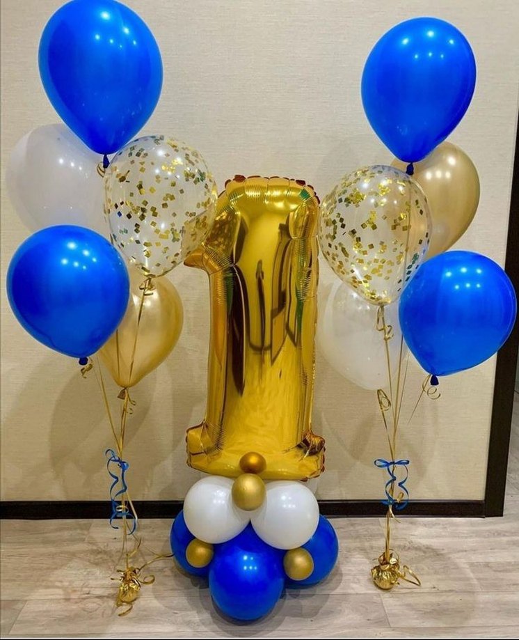 Büyük altın 1 rakamlı folyo balonun etrafında mavi, altın, beyaz ve konfeti dolu balonlarla renkli parti balon seti. görseldeki balonlar gönderilecektir