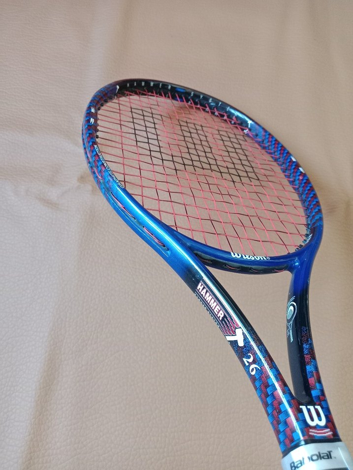 Renkli mavi çerçeve ve kırmızı tellerle Wilson Hammer 26 tenis raketidir. Dengeli yapısıyla dikkat çeker. Wilson hammer 26 inç tenis raketi kafa boyutu 100 grip L0 ağırlık 240 gram