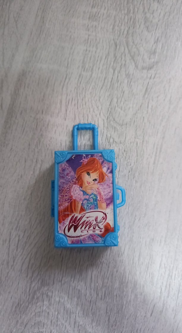 Renkli mavi çocuk okul çantası, önünde Winx Club figürü ve taşıma sapı ile küçük dikdörtgen şeklindedir.