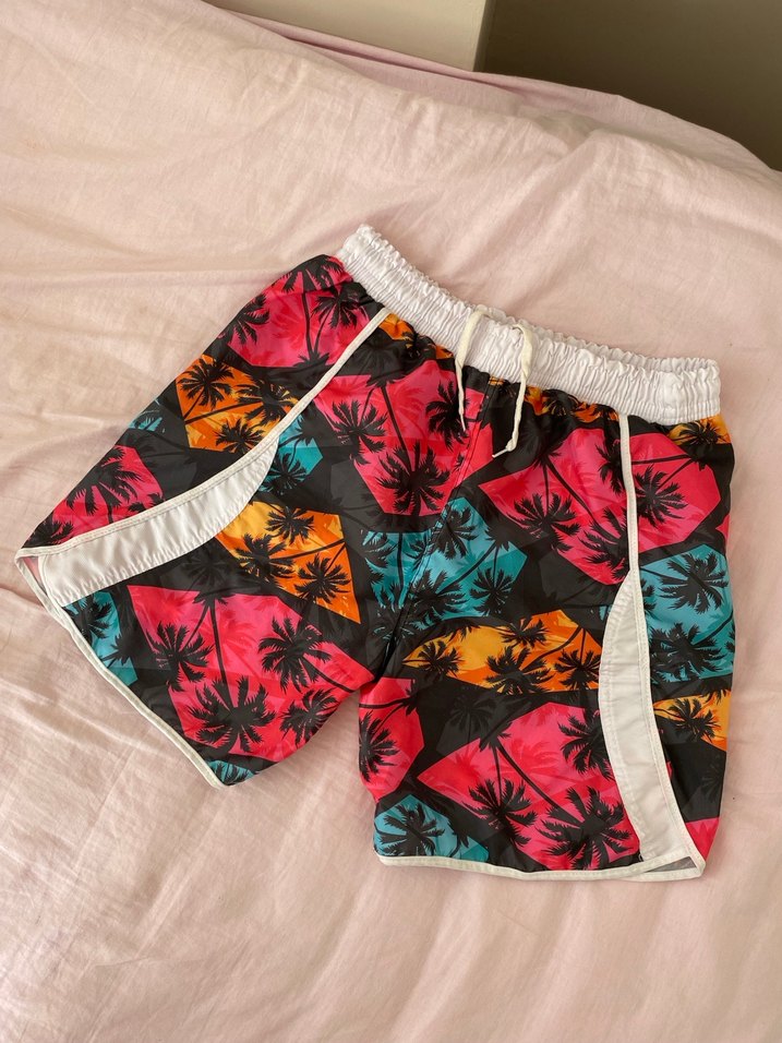 Renkli palmiyeli desenli ve lastikli bel bantlı mayo şort. Rahat ve bol kesim, plaj için uygun.