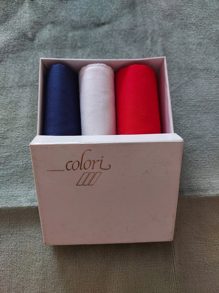 Colori-28x28 cm ölçülerinde. Fansa'dan alınmıştır. Fransız bayrak renkleri Lacivert – Beyaz – Kırmızı renklerinde 3 mendil. • Cep mendili, fular, aksesuar veya hediye için çok ideal. Kutulu olarak gönderilecektir. Hiç kullanılmamıştır. Sadece resim için kırmızı olan açılmıştır.