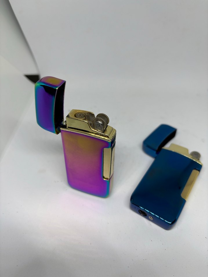 Renkli çok tonlu metal çakmak, kapaklı tasarıma sahip.