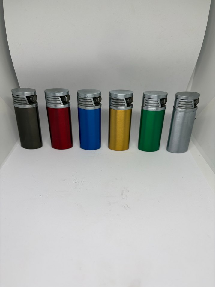 Kırmızı, mavi, sarı, yeşil, siyah ve gümüş renklerde metal çakmak seti. Her biri gümüş renk üst kısmı ve ateşleme düğmesine sahip.