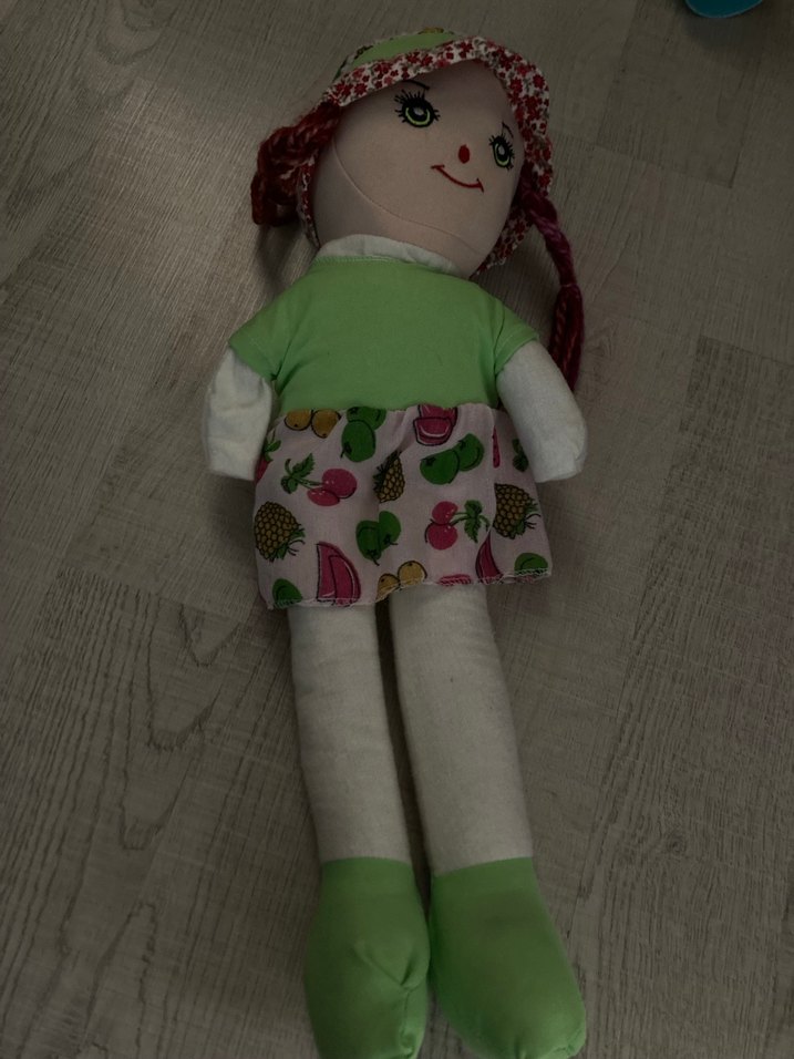 Yeşil üst ve çeşitli meyve desenli etekli, şapkalı renkli bez bebek. Uzun bacakları ve kırmızı örgülü saçı var.