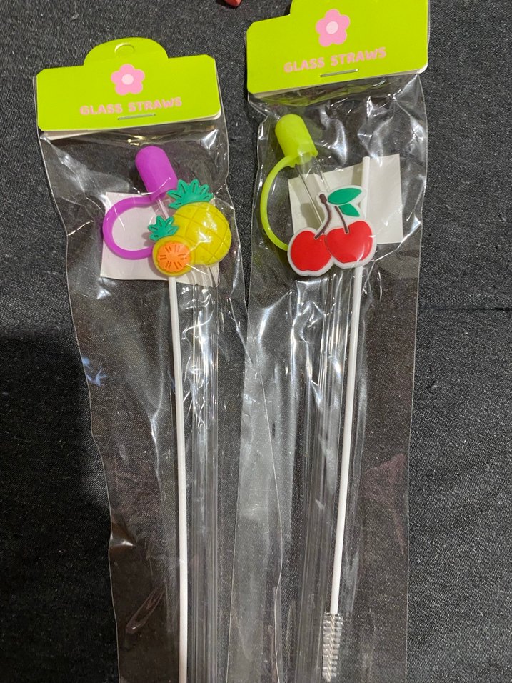 Renkli meyve figürlü cam pipetler, ananas ve kiraz süslemeleriyle. Temizleme fırçası dahil, parti malzemesi olarak uygun.