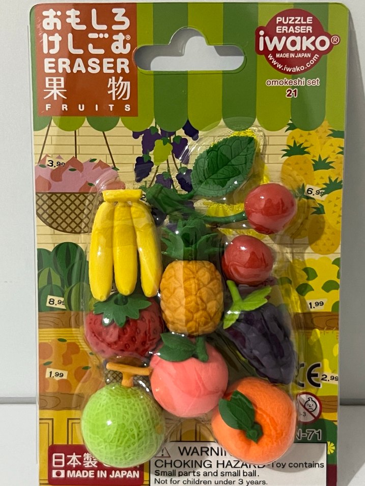 Japonya yapımı, renkli meyve şeklinde puzzle silgi seti. Küçük parçalar içerir, 3 yaş altı çocuklar için uygun değildir.