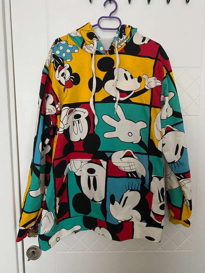 Renkli Mickey Mouse baskılı, düğmeli kapüşonlu, bol kesim, uzun kollu sewatshirt eşofman takımı. Yumuşak sentetik kumaştan, rahat ve günlük kullanım için uygundur.