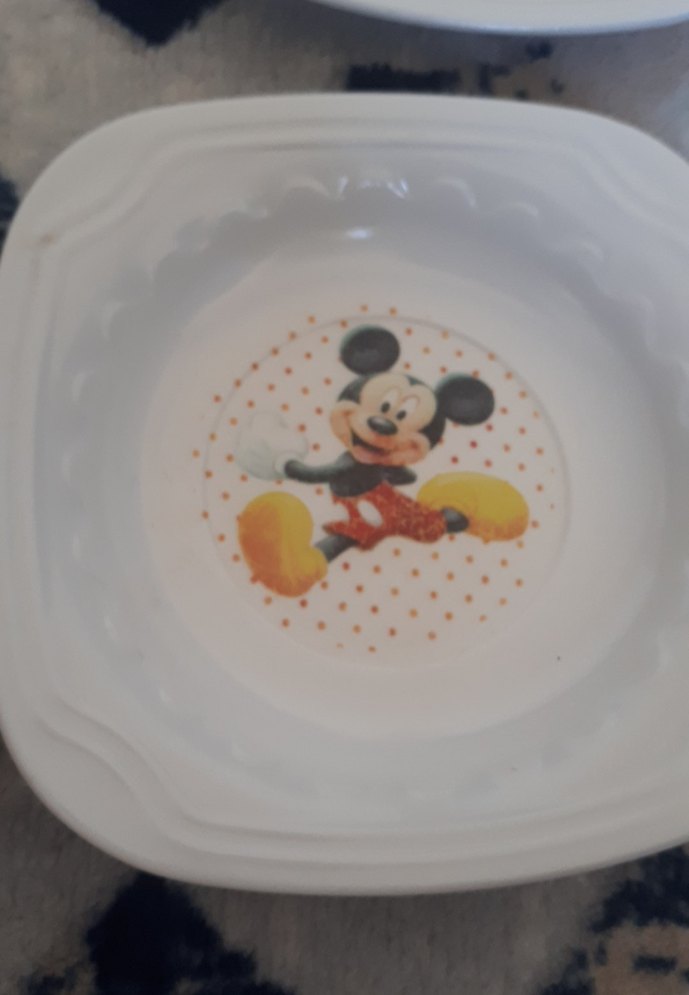 Renkli Mickey desenli beyaz yemek kapları