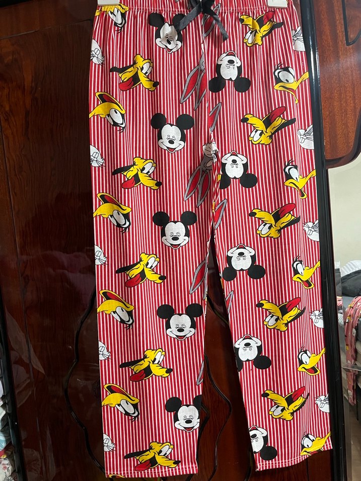 Rahat kesim, pile detaylı kırmızı pijama altı, renkli Mickey ve arkadaşları baskılı desenle dikkat çekiyor.