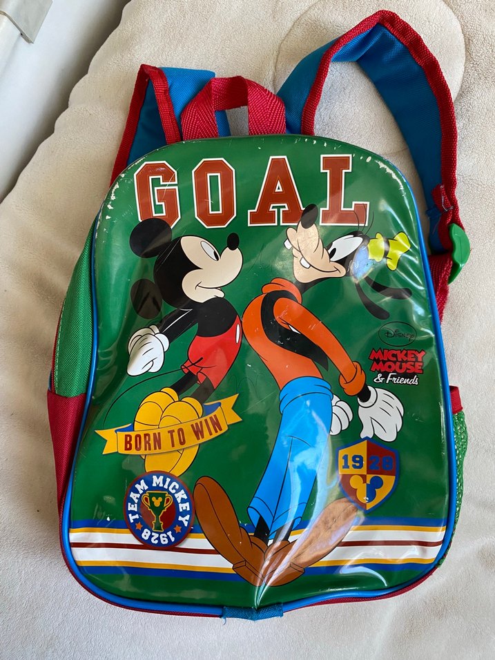 Renkli çocuk okul çantası, üzerinde Mickey Mouse ve Goofy figürleri ile "GOAL" yazısı bulunur. Ayarlanabilir kırmızı ve mavi askıları vardır.