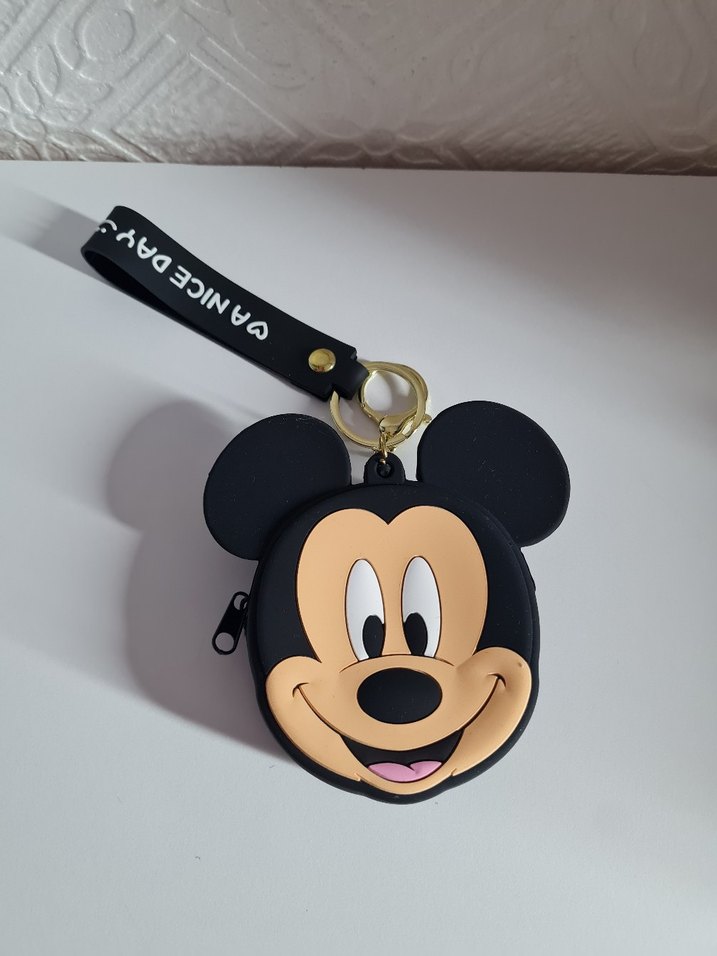 Fermuarlı, renkli Mickey Mouse yüz baskılı çocuk cüzdanı, siyah yazılı kayışla pop kültür ve eğlenceli tasarımı birleştirir.