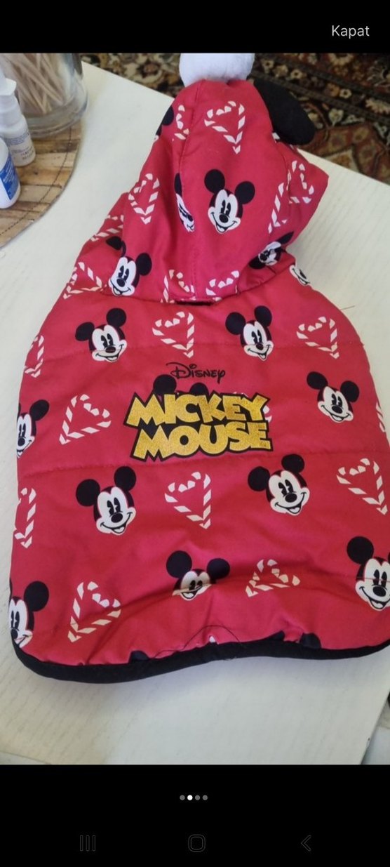 Renkli pembe kapüşonlu köpek kıyafeti, Mickey Mouse baskılı ve fermuarlı, pop kültür tarzı ve pratik tasarım sunar.