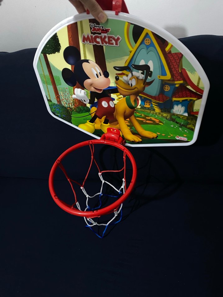 Mickey Mouse ve Pluto figürlü, renkli basketbol potasıdır. Kırmızı çember ve beyaz-mavi file içerir.